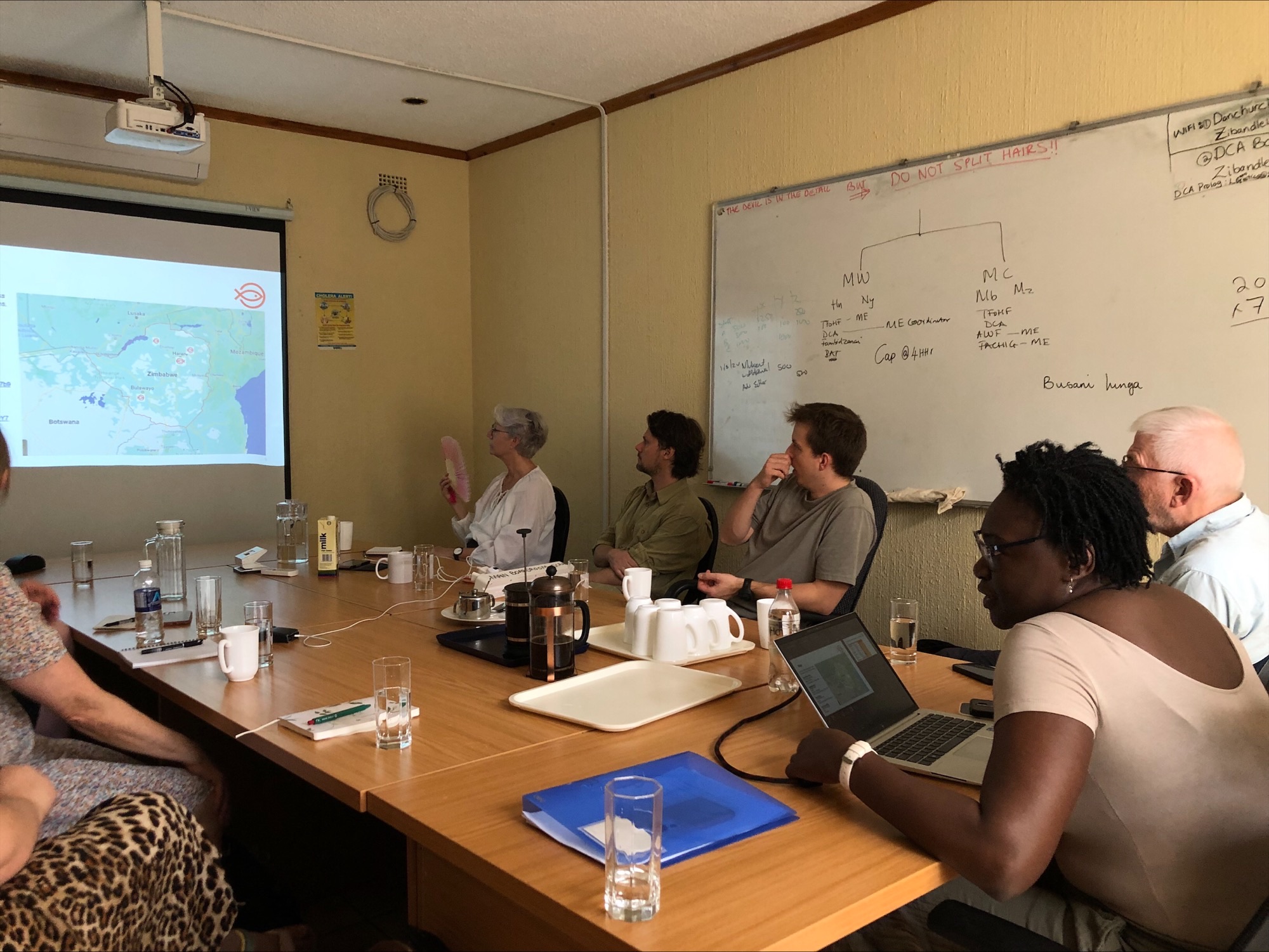 Et tema der gentages adskillige gange er forholdet mellem de vilde dyr og mennesker. Af politiske årsager har de zimbabwere, vi besøger, siden begyndelsen af 1980’erne boet der, hvor elefanter, løver, hyæner og bavianer holder til. Mennesker og dyrene er kommet for tæt på hinanden. Vi besøger landsbyen Otel, hvor en af Nødhjælpens samarbejdspartnere sammen med landsbyen har udviklet en metode til at holde elefanterne væk fra landsbyens vand og de lækre tomater, som de også godt kan lide. En blanding af tørret elefantlort, chili og brugt motorolie bliver til et kæmpestort fyrfadslys, som beboerne anbringer rundt om deres grøntsagsmarker og tænder om natten. Elefanter kan hverken lide motorolie eller chili og kan lugte det 4 km væk og holder sig på afstand - lige indtil de finder ud af at gå en anden vej, hvor vinden ikke river dem chilien i snabelen. Elefanter er ikke bare store dyr - de har også en stor og klog hjerne .Vi overnatter ved den kæmpestore kunstige sø, Kariba. Det er første gang jeg er blevet hentet af en sikkerhedsvagt på mit værelse for at følge mig ned til restauranten - han skal beskytte mig i fald der skulle komme en flodhest eller en bavian i vejen.